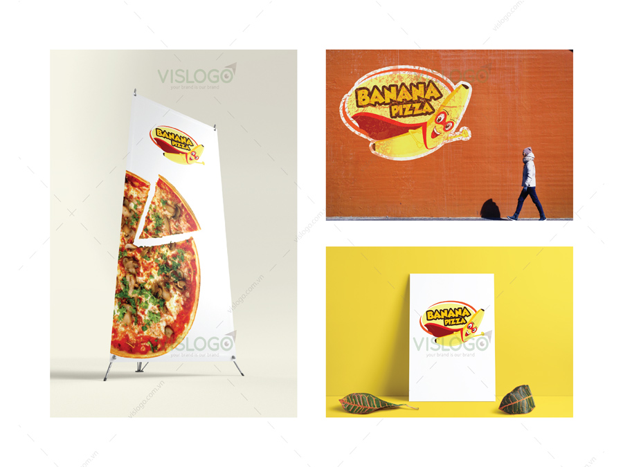 Logo được thiết kế bằng hình tượng "supper chuối" ngộ nghĩnh, bắt mắt phù hợp với đối tượng khách hàng mà thương hiệu nhắm tới, phần tên thương hiệu được đặt trên phần khung tượng trưng cho đế của bánh pizza