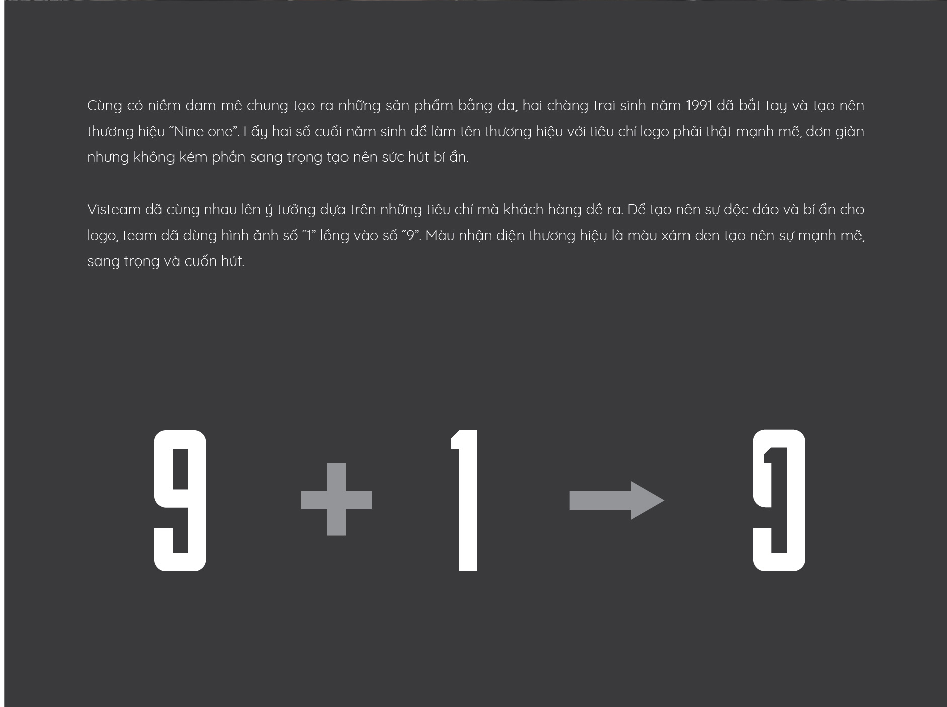 NINEONE - Số 91 có ý nghĩa là sự khởi đầu mới, luôn tìm kiếm những cơ hội mới. Logo đề xuất với biểu tượng là sự lồng ghép hai số 9 và 1 , font chữ không chân, màu xám đen được sử dụng tạo sự mạnh mẽ, sang trọng, đơn giản và bí ẩn